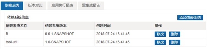 2.4 用例编写示例编写示例为两个系统之间的测试串联, 主要涉及两个子系统A、B和工具类tool-util.如果A系统需要调用B系统的Dubbo接口bizOrderAiFacade的方法bizOrder, 用于落业务单操作并使用工具类的方法打印自定义日志, 则A系统需要添加B系统和工具类tool-util作为依赖.由于开发迭代, 一个子系统或工具类会对应多个版本, 需要选择选择依赖的子系统及对应的版本进行添加, 依赖关系可视化页面展示如图 5所示.