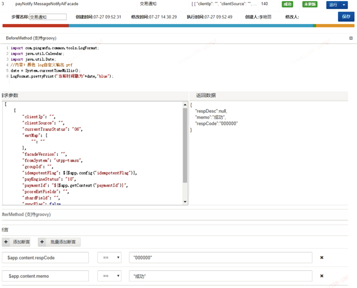 测试步骤包括前置脚本(BeforeMethod)、后置脚本(AfterMethod), 脚本里可以使用工具类的方法, 比如日志打印.接口请求参数及返回数据.请求参数的赋值可以参数化: idempotentFlag通过配置项的方式赋值; paymentId通过上下文的方式赋值.断言可以通过3种方式编写:添加断言(添加单条验证点)、批量添加断言、脚本方式验证.点击运行, 获取测试用例执行结果.