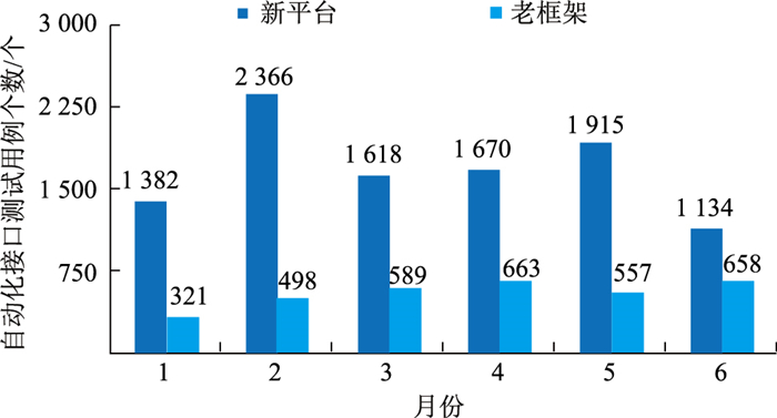 3.3 新平台与老框架自动化接口测试用例增长对比数据图 8展示了新平台与老框架按月统计(1月份——6月份)的测试用例增长数据, 每个月月底统计当月的测试用例增长情况.从数据可以看出, 老框架的测试用例数据为以百位增长, 新平台的自动化用例则以千位增长.每个月的数据增长有变化, 主要是由功能测试人员的时间决定, 如果功能测试任务较重, 则花费在自动化上的时间会减少.新平台门槛相对较低, 测试人员在功能测试的同时, 可以基于新平台编写自动化用例进行测试.