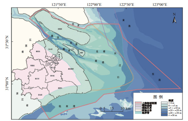 1 研究区概况上海市(30.5°N-32°N, 121°E-123°E)位于我国大陆海岸线中部, 处于长江入海口和东海交汇处, 面向东海、北接江苏、南临浙江, 区位优势明显, 且拥有港口航道、滩涂湿地、滨海旅游、海洋风能和潮汐能等众多海洋资源.依据国务院批复的《上海市海洋功能区划(2011-2020年)》, 上海市海域包括:西界为大陆岸线, 东界为我国领海外部界限, 南界为沪浙分界线, 北界为沪苏分界线, 面积约10 754.6 km2(见图 1).