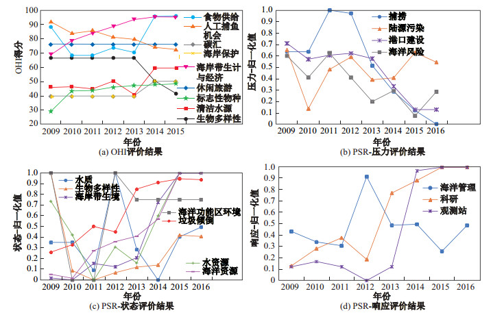 虽然OHI与PSR评价指标体系和计算方法不同, 但是两种模型构建原则相同, 都是基于"压力-状态-响应"来构建的, 其中PSR中的指标则考虑了更多上海典型指标, 如海洋灾害风险和港口建设.两种模型评价结果一致, 都反映了上海海洋的健康状况有所改善, 但是总体仍处于亚健康状态.评价结果反映了上海的海洋生态系统面临陆源污染、海洋灾害、生物多样性减少和人工捕捞的可持续性不足的问题。